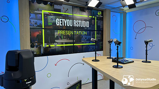 Complete studio for livestreaming and recording, with 2 Canon PTZ cameras. Studio-in-a-Box with all built-in audio and video equipment, lighting, sound, screens, etc. With StudioAssist, the smart automated video control software from GetyourStudio.