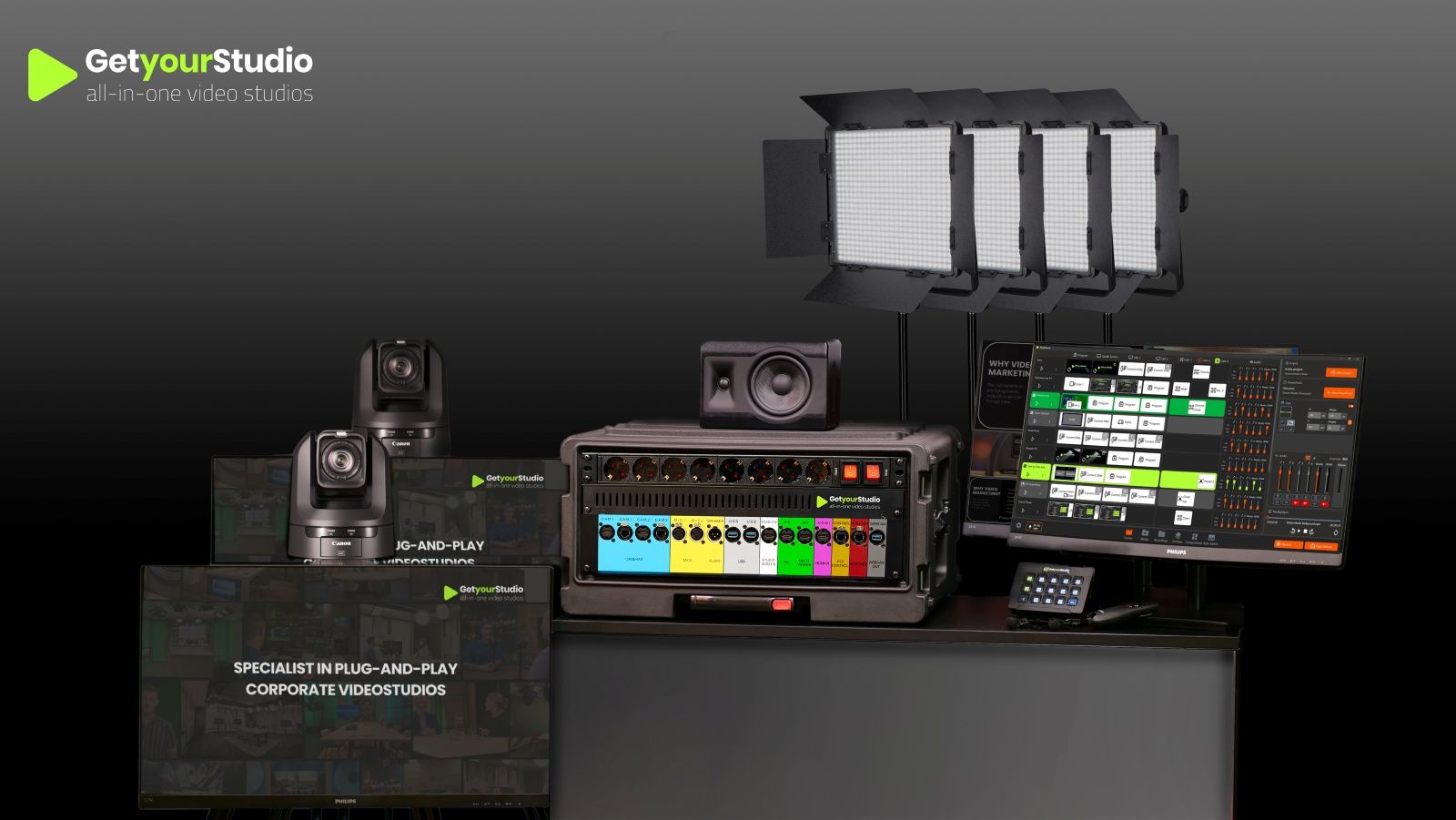 Complete studio for livestreaming and recording, with 2 Canon PTZ cameras. Studio-in-a-Box with all built-in audio and video equipment, lighting, sound, screens, etc. With StudioAssist, the smart automated video control software from GetyourStudio.