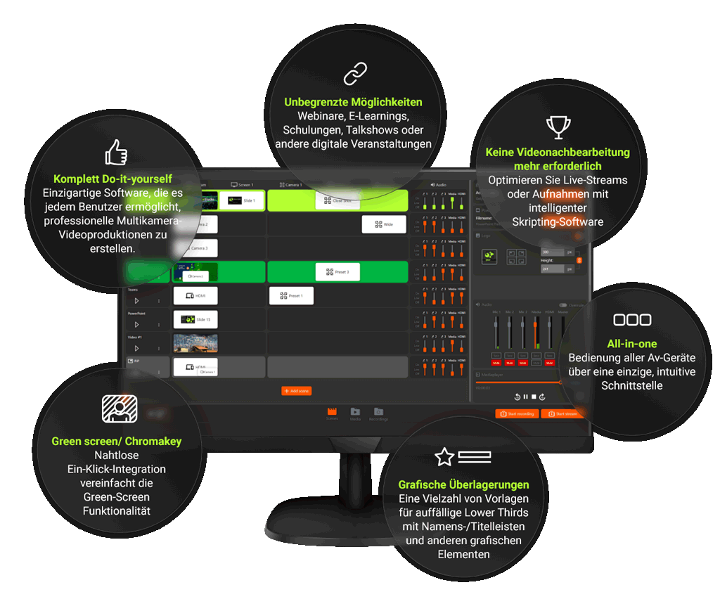 StudioAssist revolutioniert die Videoproduktion, indem es jedem, auch ohne technisches Wissen, ermöglicht, professionelle Multikamera-Videos für Webinare, E-Learnings, Talkshows und andere digitale Veranstaltungen zu erstellen. Egal, ob du live streamen, aufzeichnen oder eine hybride Lösung bevorzugen möchtest, StudioAssist bietet eine schnellere, benutzerfreundlichere, kostengünstigere und professionelle Lösung, ohne dass AV-Spezialisten eingestellt werden müssen.