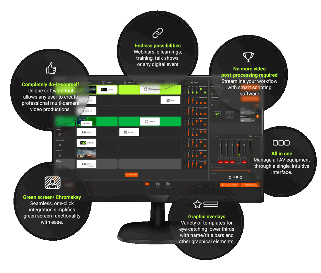 GetyourStudio is controlled by StudioAssist, our automated studio software. With StudioAssist, you can live stream and/or record webinars, online training courses, and presentations. Other content such as interviews and knowledge events can be made quickly and easily. The GetyourStudio StudioAssist software was created with the idea of doing video productions or live streams with one or more cameras yourself, without the need of external AV specialists, directors, cameramen, or colleagues. You can also operate your studio in the classic way, from the director's chair.